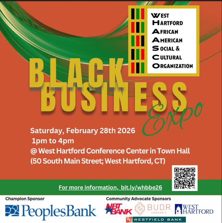 - Join the West Hartford African American Social and Cultural Organization (WHAASCO) on Saturday, February 28, 2026, from 1:00 PM to 4:00 PM at West Hartford Town Hall, 50 South Main Street, West Hartford, CT, as we proudly host the 2026 West Hartford Black Business Expo — a vibrant celebration dedicated to honoring and promoting West Hartford and Greater Hartford Black-owned businesses.